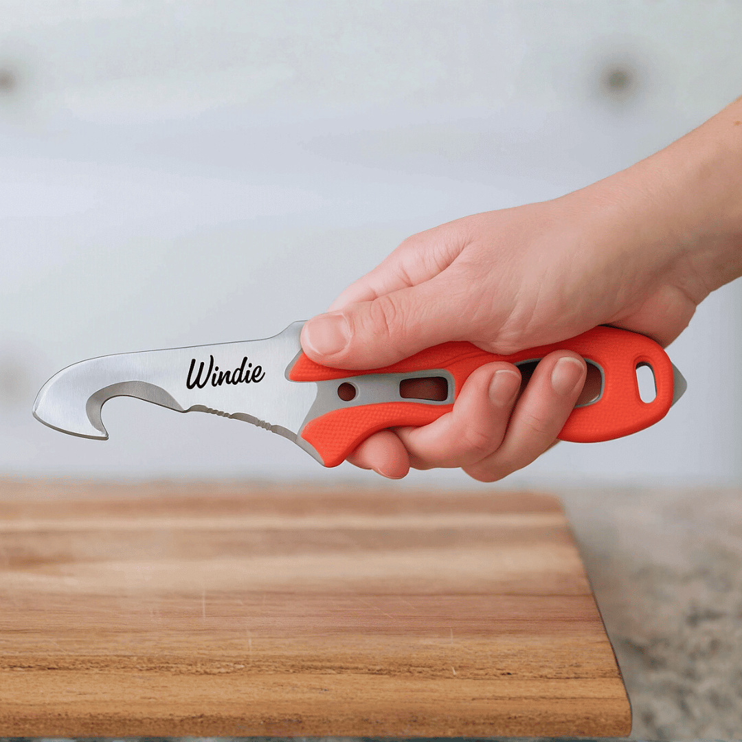The Windie Marine Rescue Knife is a lightweight stainless-steel sailing knife built for safety and precision. Its hook tip and serrated blade slice through rope and webbing instantly — without puncturing inflatable boats. Featuring a high-visibility orange handle, non-slip grip, and corrosion-resistant blade, it’s made for tough marine conditions.