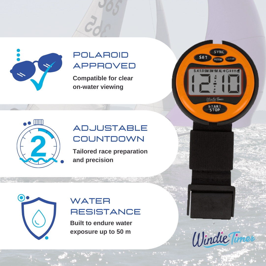 Elevate your sailing experience with the Windie-Timer Race Stop Watch in vibrant Orange. Designed for precision and reliability, it features adjustable countdowns, water resistance up to 50 meters, and a sleek 5-4-1-0 count design. The adjustable strap ensures a comfortable fit, making it perfect for all sailors, from novices to pros, and ideal for enhancing performance in sailing competitions.